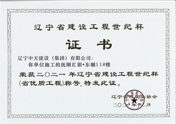 遼寧中天建設集團領導班子認真貫徹落實科學發展觀,堅持以人為本,積極培育“開拓進取,求新向上,求真務實,團結奉獻”的企業精神和“干一項工程交一方朋友,占一方市場,樹一座豐碑”的經營理念。經過遼寧中天建設者的辛勤耕耘,許多建筑精品工程象一座座豐碑聳立在撫順大地上,令人矚目。撫順市保障性住房建設工程榮獲全國優質工程金獎,撫順移動通訊綜合樓、撫順市電信綜合樓、撫順市三寶屯污水處理廠擴建及中水回用工程等多項工程獲得“遼寧省世紀杯工程”、“遼寧市政金杯”工程等殊榮。公司還多次榮獲“省建筑業質量管理先進施工企業”稱號。